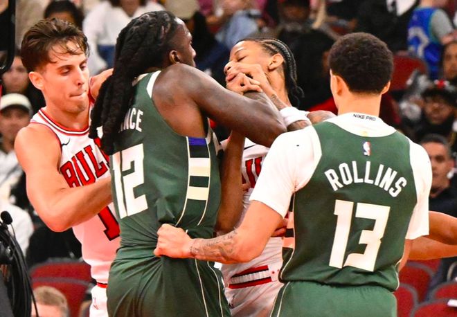 别看这只是一场季前赛,可在比赛过程却打得十分激烈,身体对抗也很强,更是在第三节最后阶段发生了冲突。当时雄鹿球员普林斯和公牛球员达伦-特里拉扯在一起,其中后者还有挥拳动作,随后两队纠缠在一起,之后被强行分开。裁判经过回放,特里被直接驱逐,雄鹿波蒂斯、普林斯和公牛科林斯、特里都吃到技术犯规。